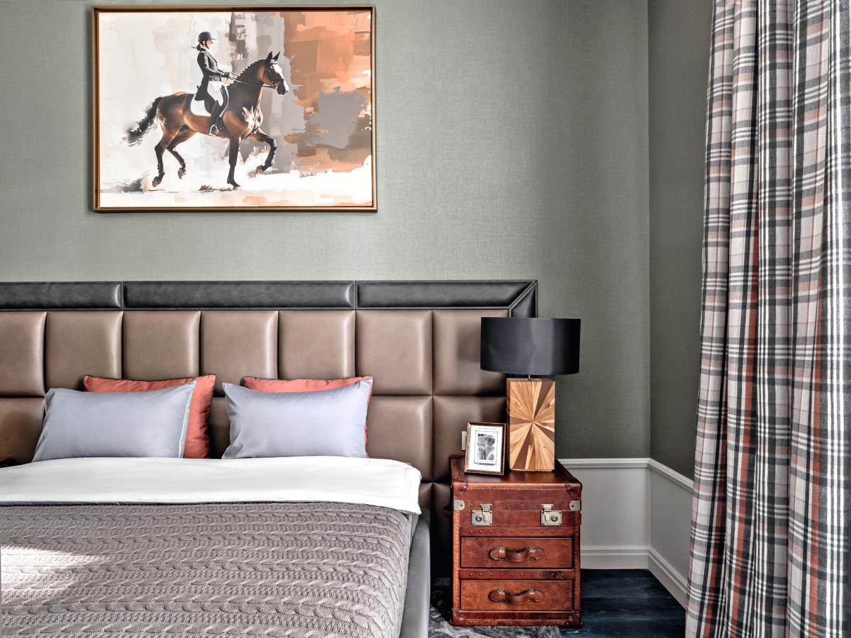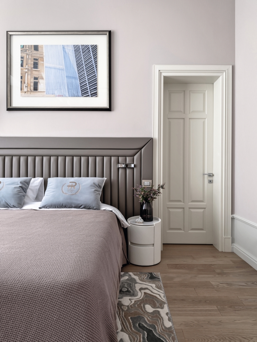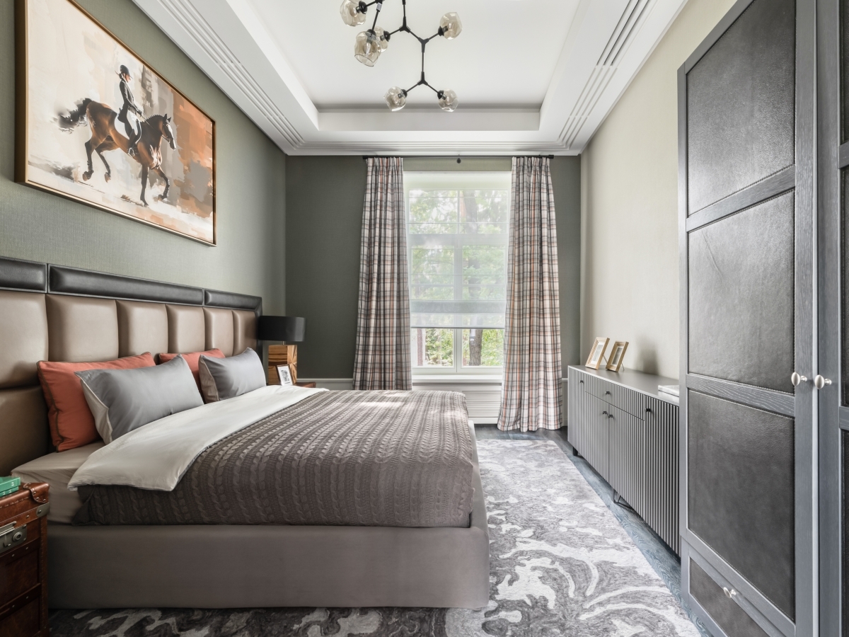 Все комнаты имеют собственный образ. «Китайскую спальню отличает декор: изображения журавлей и бамбука, сочетание темной кожи в обивке кровати с белыми геометричными вставками, — рассказывает автор. — Спальня на первом этаже вдохновлена фотоработой из личной коллекции хозяина дома, которую мы повесили в изголовье кровати. Интерьер получился артистичным, живым и наполненным деталями, которые хочется рассматривать и изучать. Это всего лишь начало для долгой истории, наполненной семейными обедами и вечерами, праздниками и спокойным отдыхом в спа».