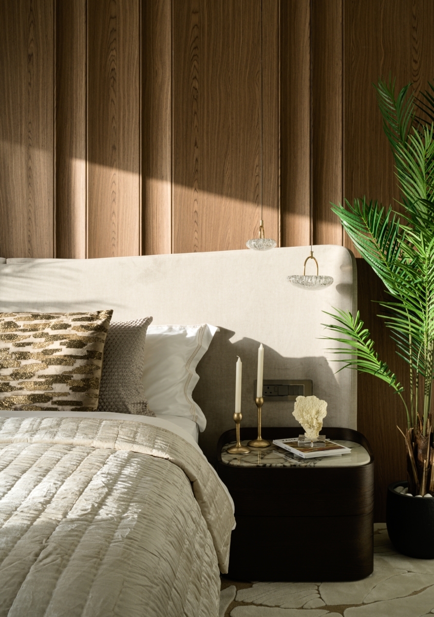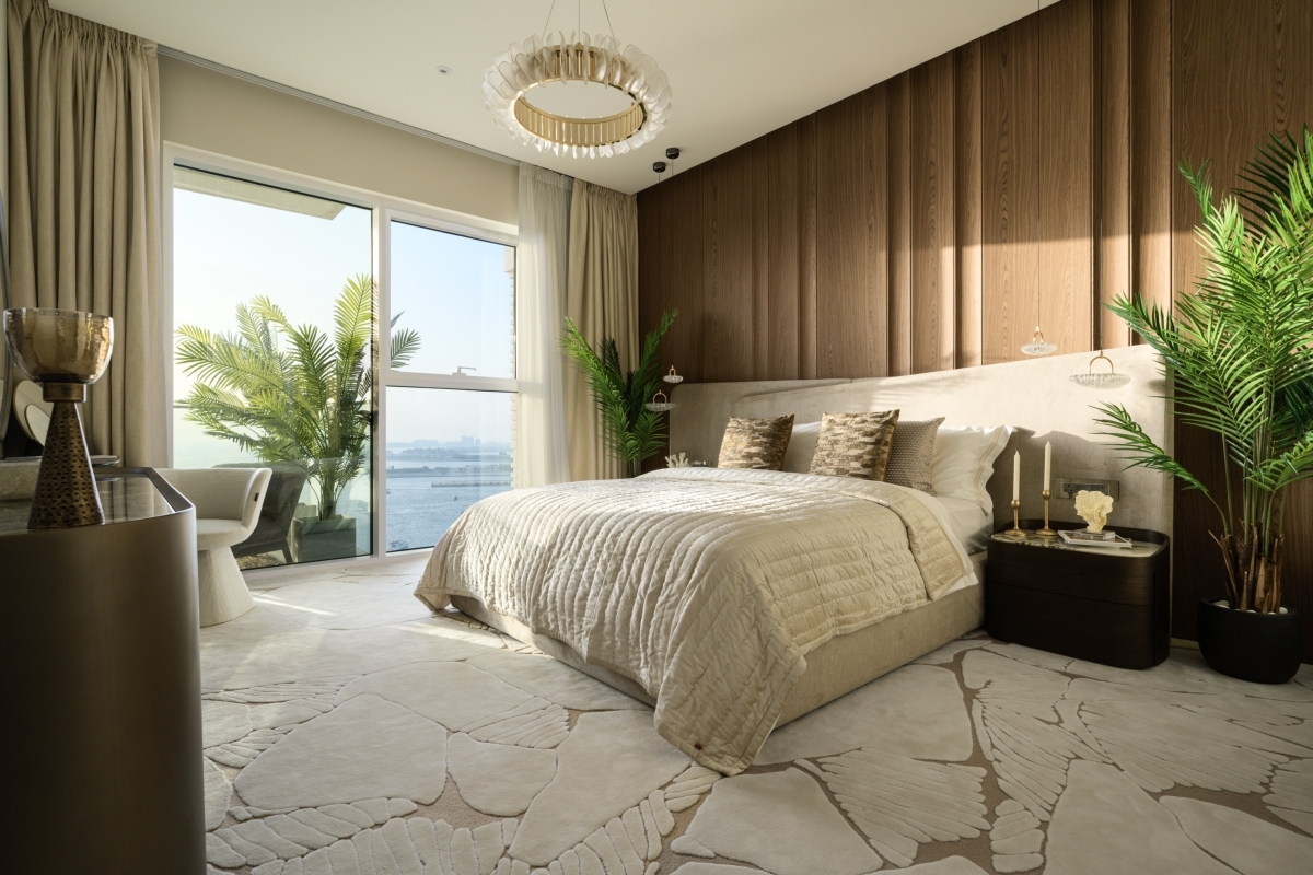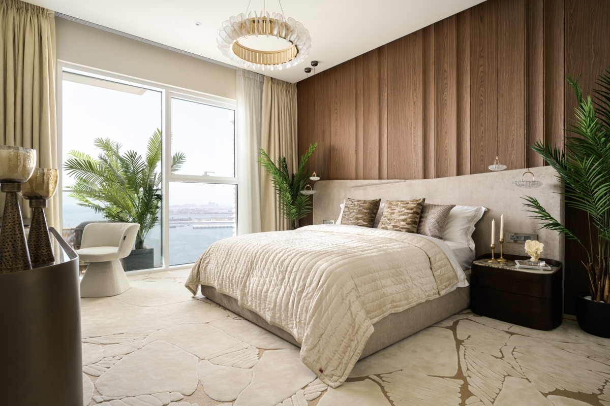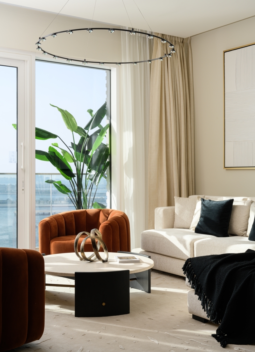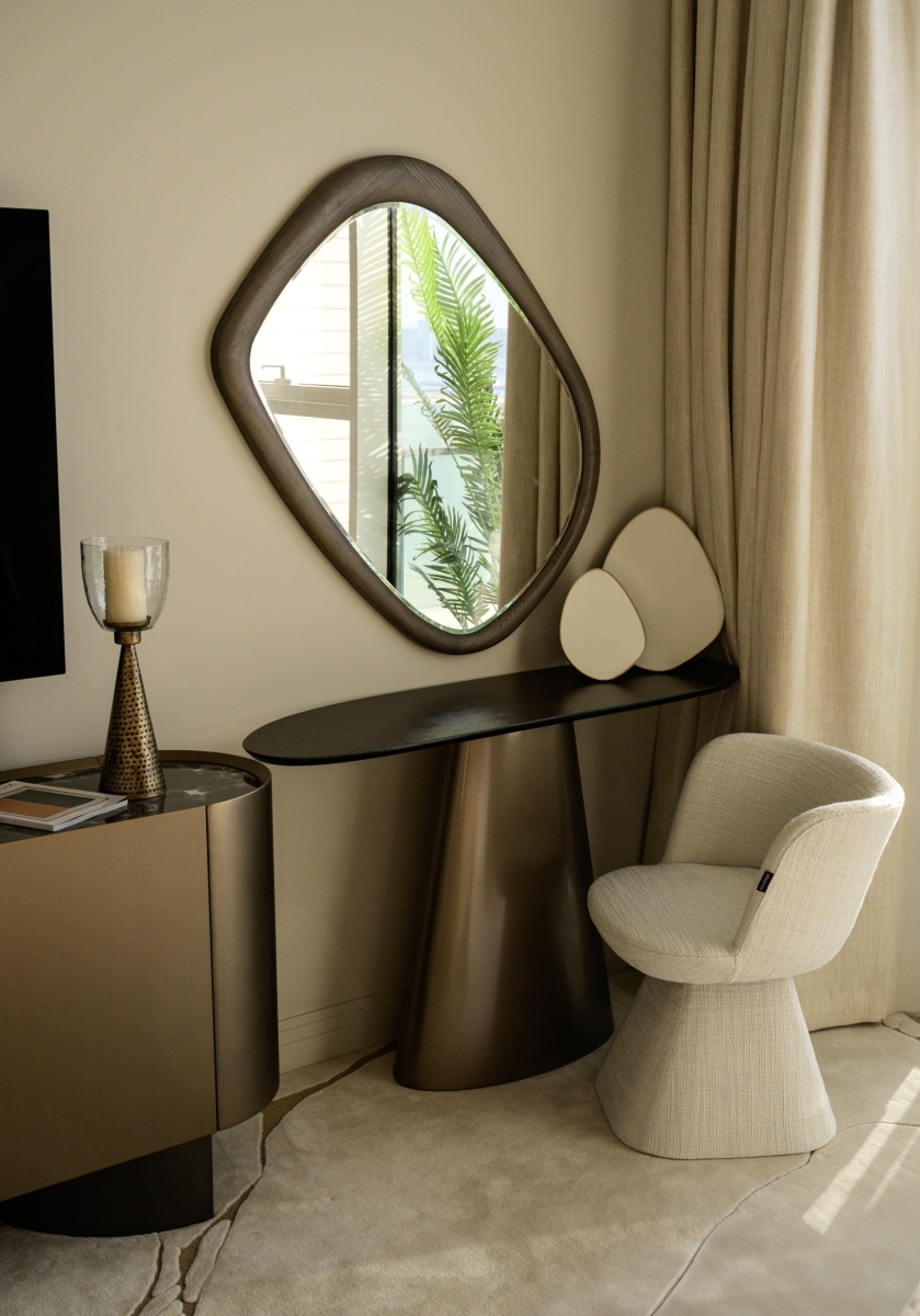 Цветовая гамма и фактуры вдохновлены пейзажами Дубая. Теплые оттенки песка, камней и морской пены в сочетании с плавными линиями и тактильно приятными материалами создают легкое, утонченное настроение. Отсылки к растительному и водному миру читаются в обтекаемых силуэтах мебели и богатой фактуре текстиля.