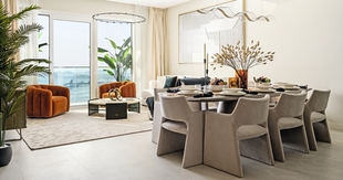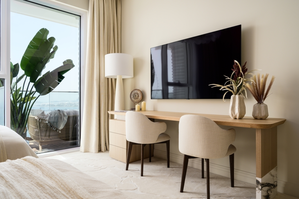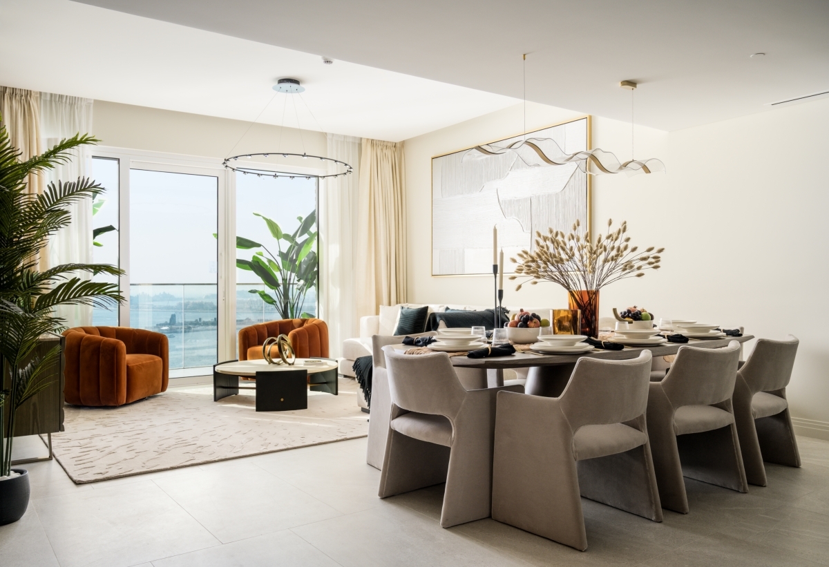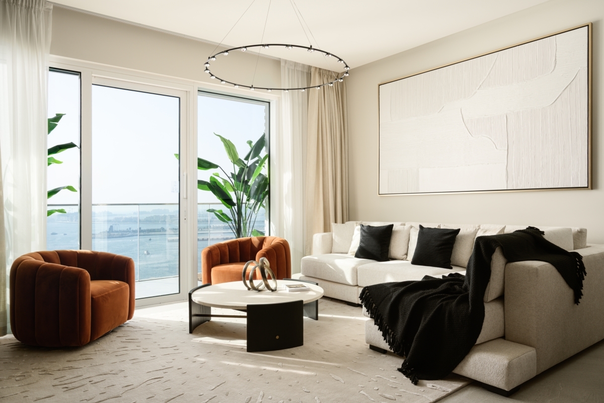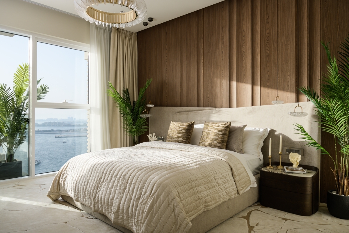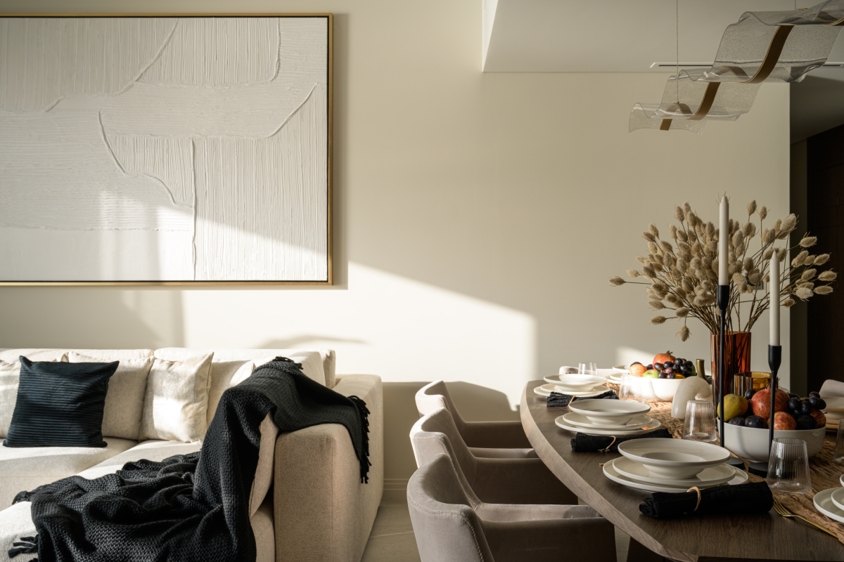 Цветовая гамма и фактуры вдохновлены пейзажами Дубая. Теплые оттенки песка, камней и морской пены в сочетании с плавными линиями и тактильно приятными материалами создают легкое, утонченное настроение. Отсылки к растительному и водному миру читаются в обтекаемых силуэтах мебели и богатой фактуре текстиля.