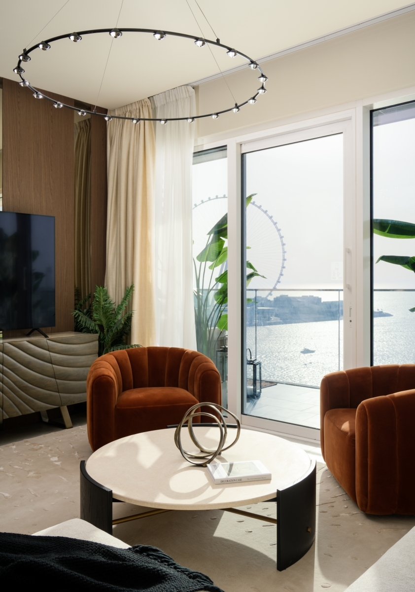 Элементы декора то и дело «рифмуются» с окружающим пейзажем. Самый яркий пример — эффектная кольцевая люстра в гостиной, которая по форме напоминает силуэт колеса обозрения за окном. Учитывая особенности климата ОАЭ, для отделки пола выбран крупноформатный керамогранит, который стал не только функциональным, но и эстетически выверенным решением. На стенах — шпонированные панели с тонированными зеркальными вставками цвета бронзы. Кресла, американский бренд CB2.