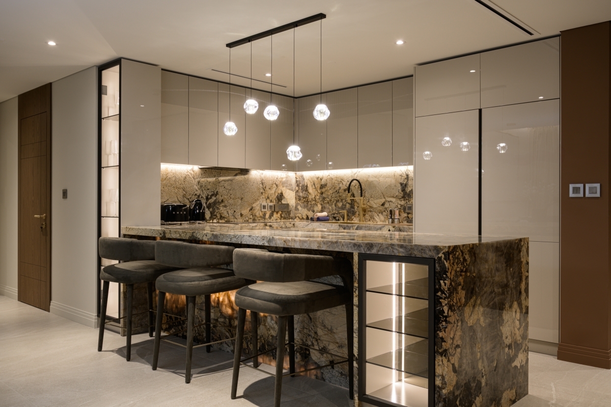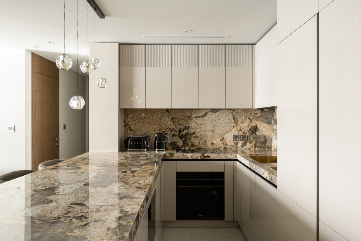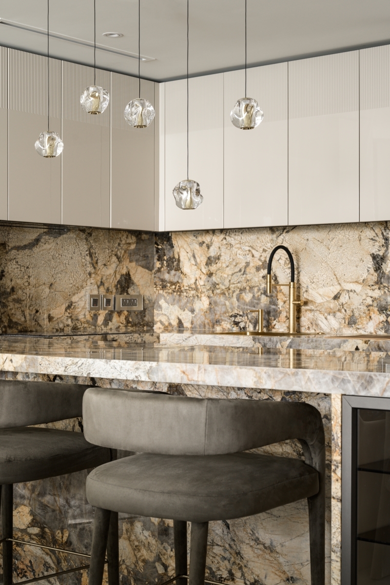 Зона кухни. Кухонная мебель и двери разработаны и созданы совместно с мебельным производством Noor-Hayat. Технические решения продуманы до мелочей, а примыкания и сложные узлы проработаны безупречно. Фартук, столешницы и подстолье выполнены из кварцита Patagonia. Дизайнеры всего мира ценят этот премиальный материал за уникальный и драматичный рисунок камня, созданный самой природой. Зона кухни. Кухонная мебель и двери разработаны и созданы совместно с мебельным производством Noor-Hayat. Технические решения продуманы до мелочей, а примыкания и сложные узлы проработаны безупречно. Фартук, столешницы и подстолье выполнены из кварцита Patagonia. Дизайнеры всего мира ценят этот премиальный материал за уникальный и драматичный рисунок камня, созданный самой природой.