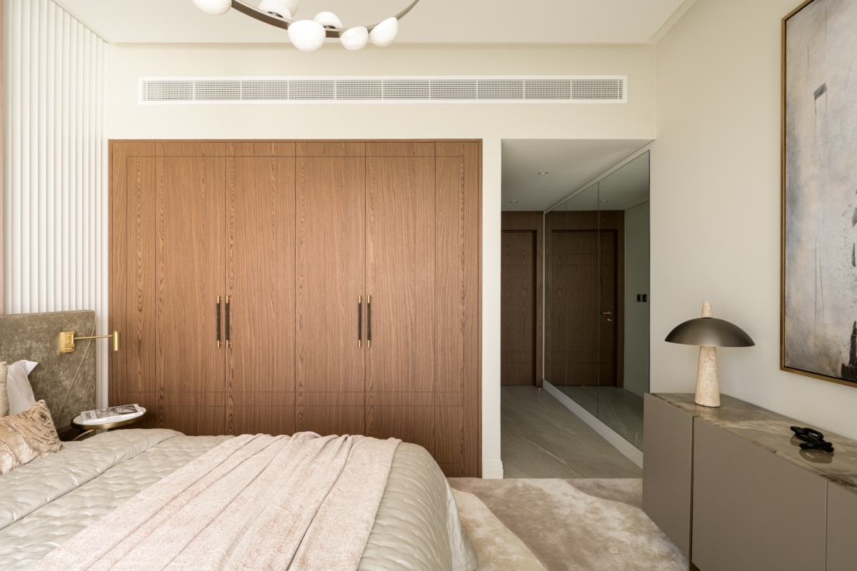 Гостевая спальня. Акцентная стена украшена панелями с фрезеровкой в виде тонких волн. За комфорт и защиту от яркого солнца отвечают шторы блэкаут с электроприводом и дистанционным управлением — идеальное решение для жаркого и солнечного климата ОАЭ. Гостевая спальня. Акцентная стена украшена панелями с фрезеровкой в виде тонких волн. За комфорт и защиту от яркого солнца отвечают шторы блэкаут с электроприводом и дистанционным управлением — идеальное решение для жаркого и солнечного климата ОАЭ.