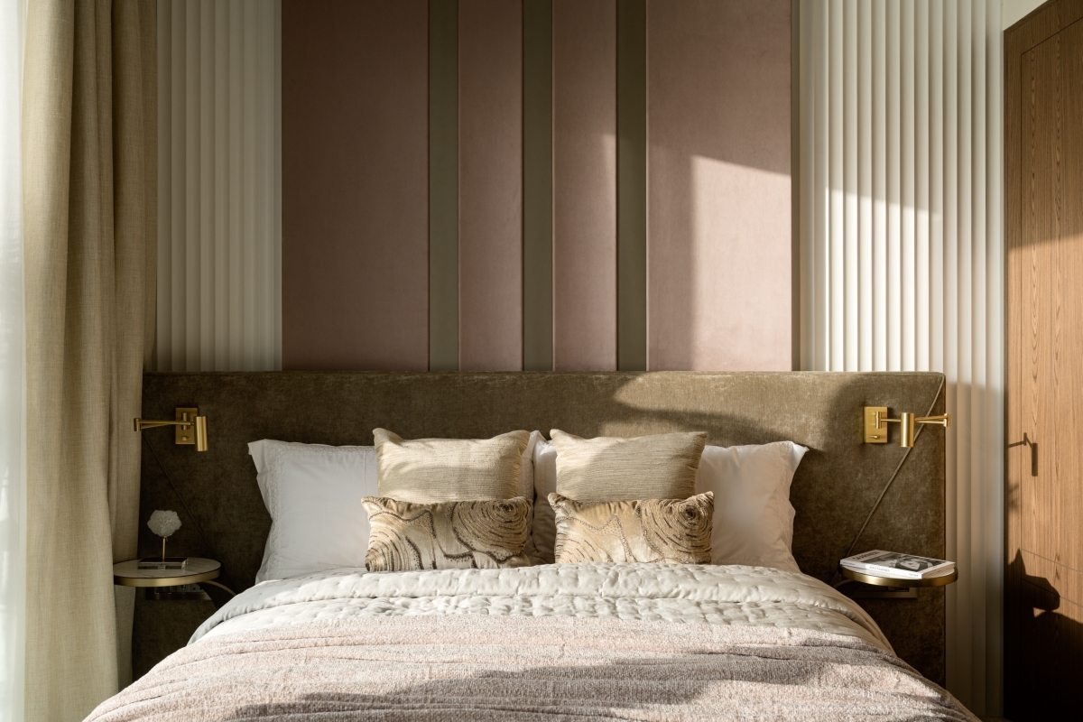 Слева фрагмент детской. Акцентная стена облицована шпонированными панелями из эвкалиптового дерева, которые задают пространству особый графический ритм. Мягкие панели и кровать с подъемными механизмами обиты итальянским велюром, который, словно хамелеон, меняет свой оттенок в зависимости от освещения. Вечером он может приобретать теплый терракотовый тон, а утром — нежный пудрово-розовый. Справа спальня. Теплая песочная палитра поддерживает камерную, обволакивающую атмосферу. На ее фоне предметы мебели приглушенных темных тонов и золотистый декор выступают мягкими, ненавязчивыми акцентами, которые не нарушают общее настроение. «В интерьере много изделий с гнутым шпоном — например, стеновая панель в спальне хозяев, — комментирует Алексей Фирсов. — Такая тонкая работа оказалась по силам только мастерам производства Noor-Hayat — они всегда держат высочайшую планку качества». Слева фрагмент детской. Акцентная стена облицована шпонированными панелями из эвкалиптового дерева, которые задают пространству особый графический ритм. Мягкие панели и кровать с подъемными механизмами обиты итальянским велюром, который, словно хамелеон, меняет свой оттенок в зависимости от освещения. Вечером он может приобретать теплый терракотовый тон, а утром — нежный пудрово-розовый. Справа спальня. Теплая песочная палитра поддерживает камерную, обволакивающую атмосферу. На ее фоне предметы мебели приглушенных темных тонов и золотистый декор выступают мягкими, ненавязчивыми акцентами, которые не нарушают общее настроение. «В интерьере много изделий с гнутым шпоном — например, стеновая панель в спальне хозяев, — комментирует Алексей Фирсов. — Такая тонкая работа оказалась по силам только мастерам производства Noor-Hayat — они всегда держат высочайшую планку качества».