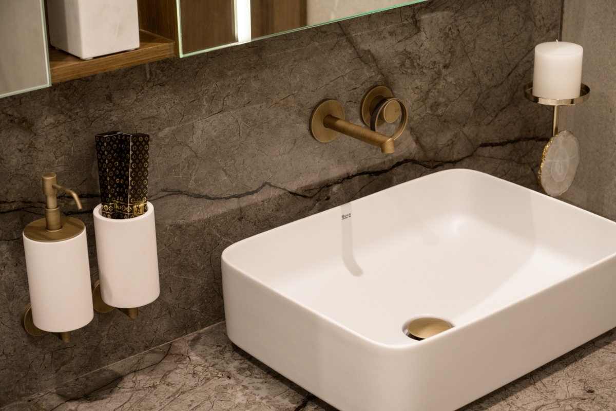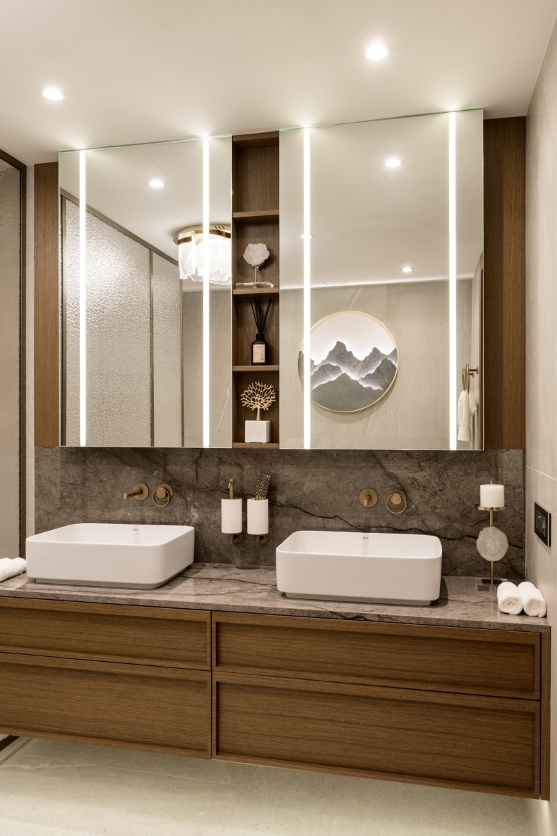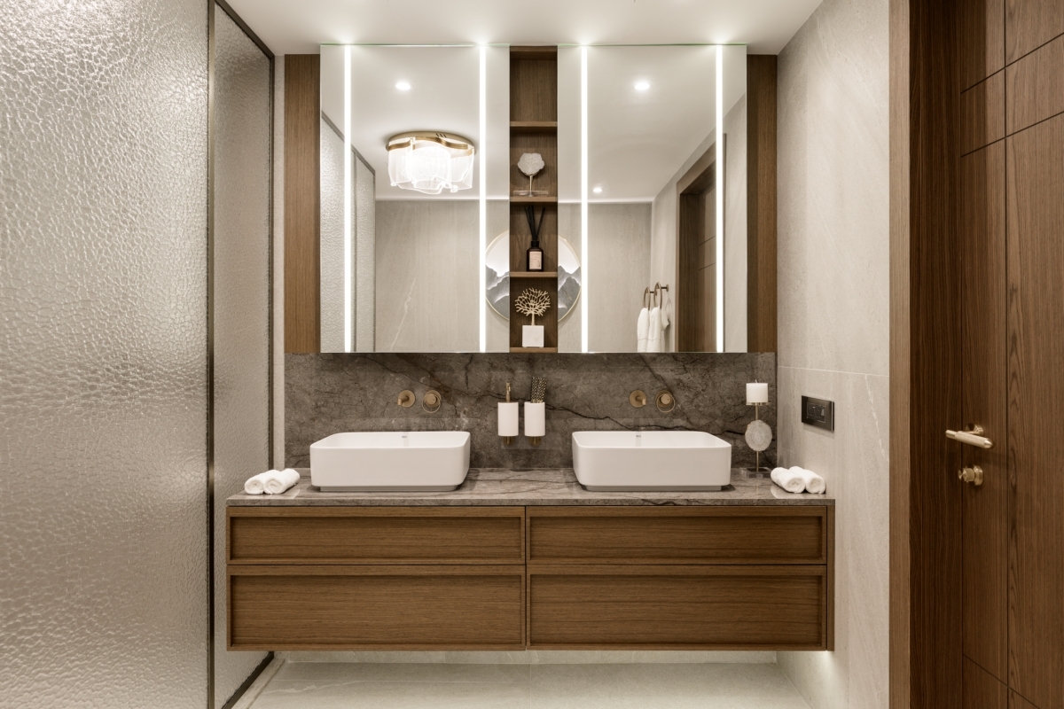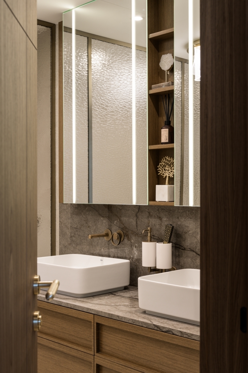 Особого внимания заслуживает подсветка. В интерьере запроектированы несколько различных сценариев освещения. Ванная комната выстроена вокруг шпонированной тумбы в тон дверям, с натуральным камнем на столешнице и простенке — символам природной роскоши. Сантехника Gessi в эксклюзивном оттенке 713 Antique Brass превращает функциональные детали в ювелирные акценты. Умный унитаз TOTO добавляет пространству японского комфорта и инноваций. В этом интерьере итальянская эстетика встречается с технологиями XXI века. Особого внимания заслуживает подсветка. В интерьере запроектированы несколько различных сценариев освещения. Ванная комната выстроена вокруг шпонированной тумбы в тон дверям, с натуральным камнем на столешнице и простенке — символам природной роскоши. Сантехника Gessi в эксклюзивном оттенке 713 Antique Brass превращает функциональные детали в ювелирные акценты. Умный унитаз TOTO добавляет пространству японского комфорта и инноваций. В этом интерьере итальянская эстетика встречается с технологиями XXI века.