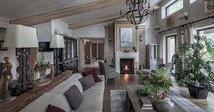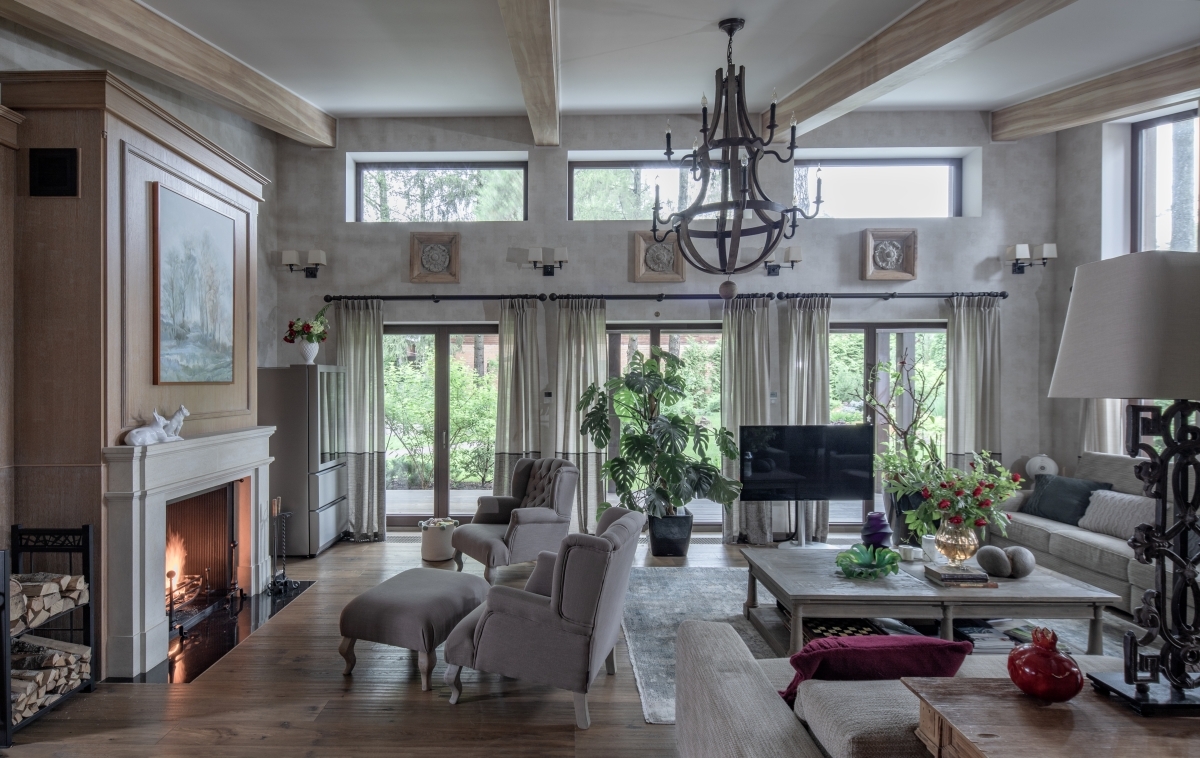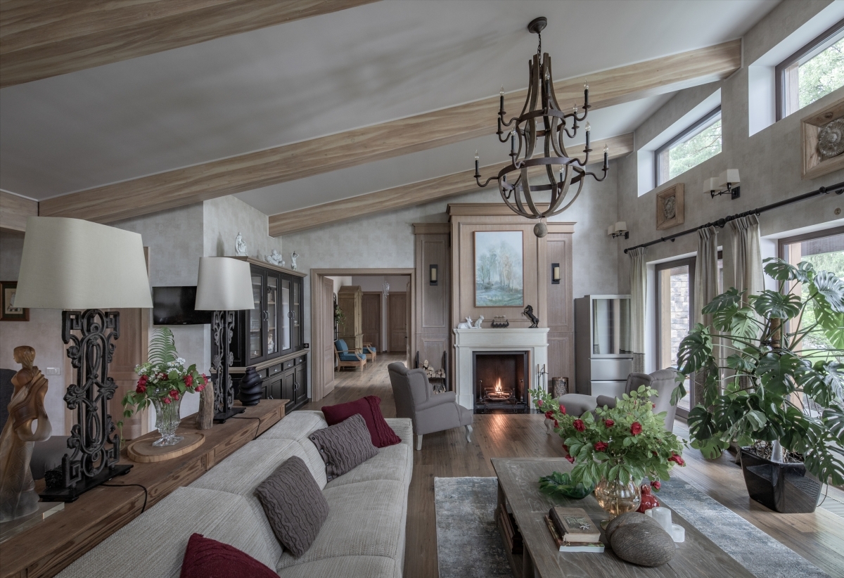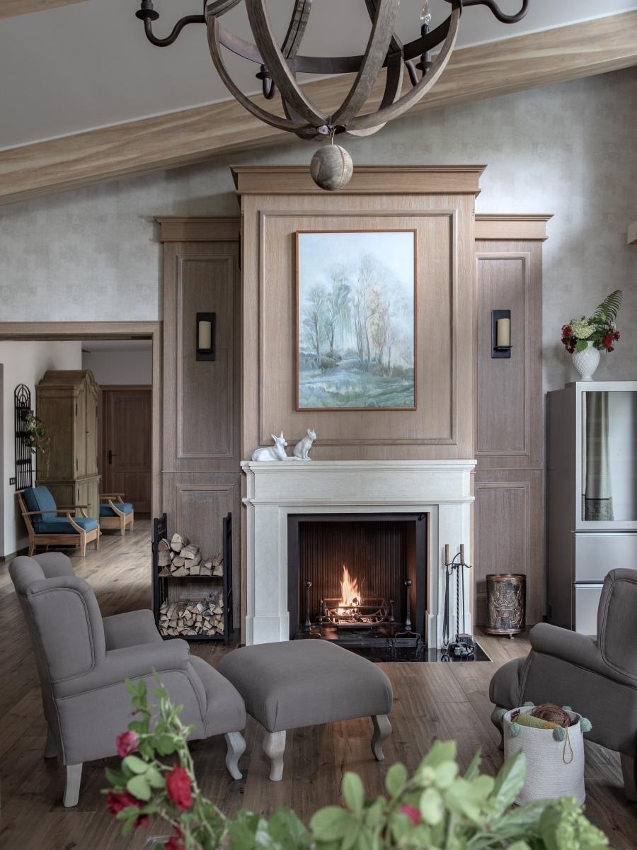 В гостиной потолочные балки из клееного бруса задают ритм пространства. Чтобы смягчить технологичность материала, архитекторы сделали лессировку клееного дерева материалом компании «Италика». Теперь нежный пудровый тон объединяет деревянные элементы с порталом камина и дверями. Камин изготовлен мастерами салона «Дилижанс». Картины созданы под заказ компанией «Произведения искусства для частного и общественного пространства», собравшей под своим крылом отличных художников, скульпторов, резчиков по дереву. В гостиной потолочные балки из клееного бруса задают ритм пространства. Чтобы смягчить технологичность материала, архитекторы сделали лессировку клееного дерева материалом компании «Италика». Теперь нежный пудровый тон объединяет деревянные элементы с порталом камина и дверями. Камин изготовлен мастерами салона «Дилижанс». Картины созданы под заказ компанией «Произведения искусства для частного и общественного пространства», собравшей под своим крылом отличных художников, скульпторов, резчиков по дереву.