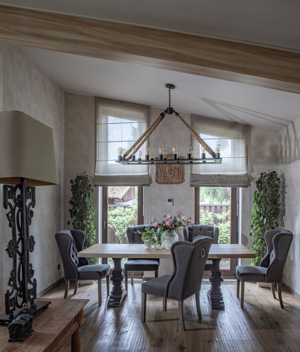 В кухне-столовой создан контраст камерности и открытости. Небольшие окна рабочей зоны с кружевными занавесками ручной работы дарят ощущение домашнего уюта, тогда как панорамные окна-двери на террасу служат главной цели — наполнить пространство светом круглый год. Барные стулья, подвесные светильники — салон «Дилижанс». В кухне-столовой создан контраст камерности и открытости. Небольшие окна рабочей зоны с кружевными занавесками ручной работы дарят ощущение домашнего уюта, тогда как панорамные окна-двери на террасу служат главной цели — наполнить пространство светом круглый год. Барные стулья, подвесные светильники — салон «Дилижанс».
