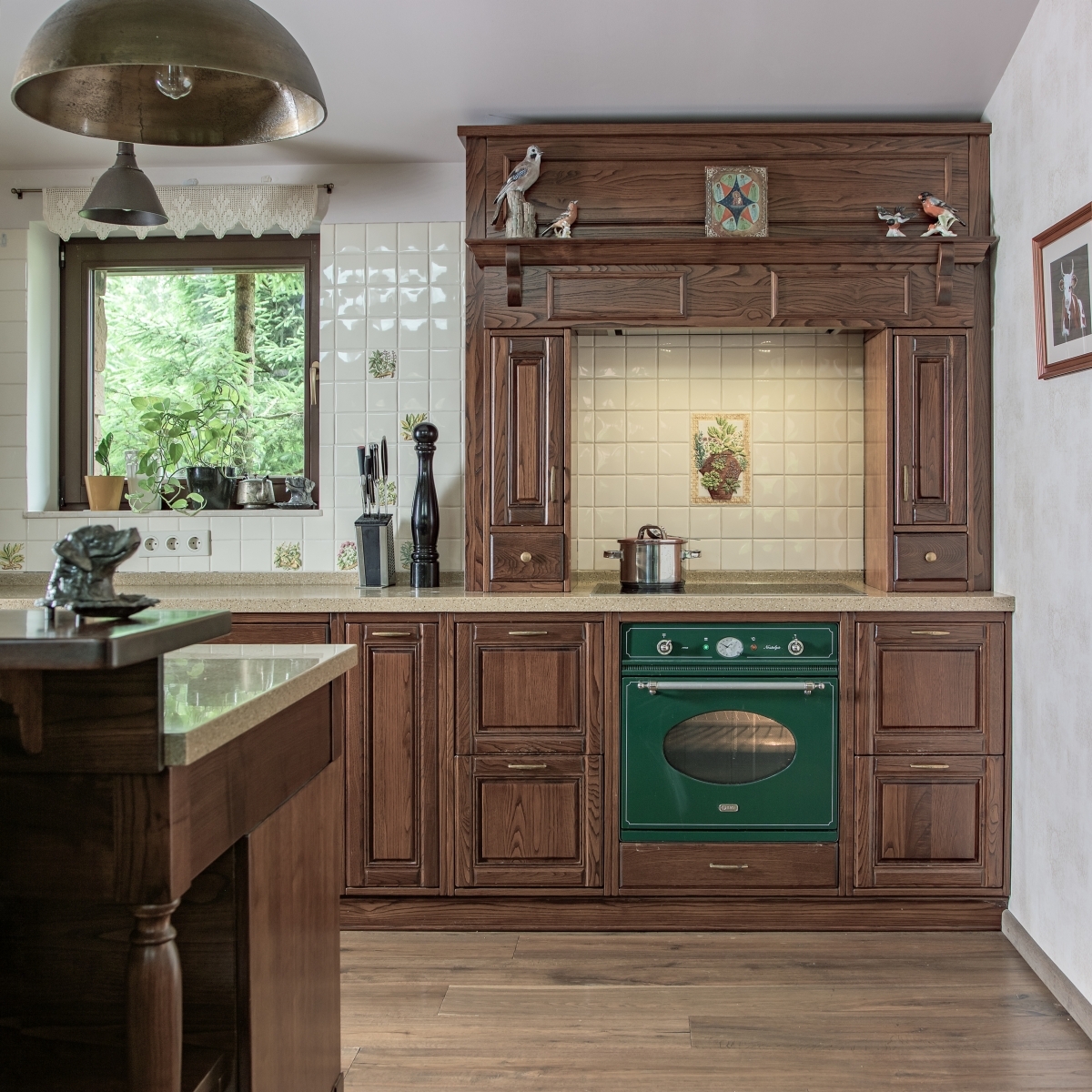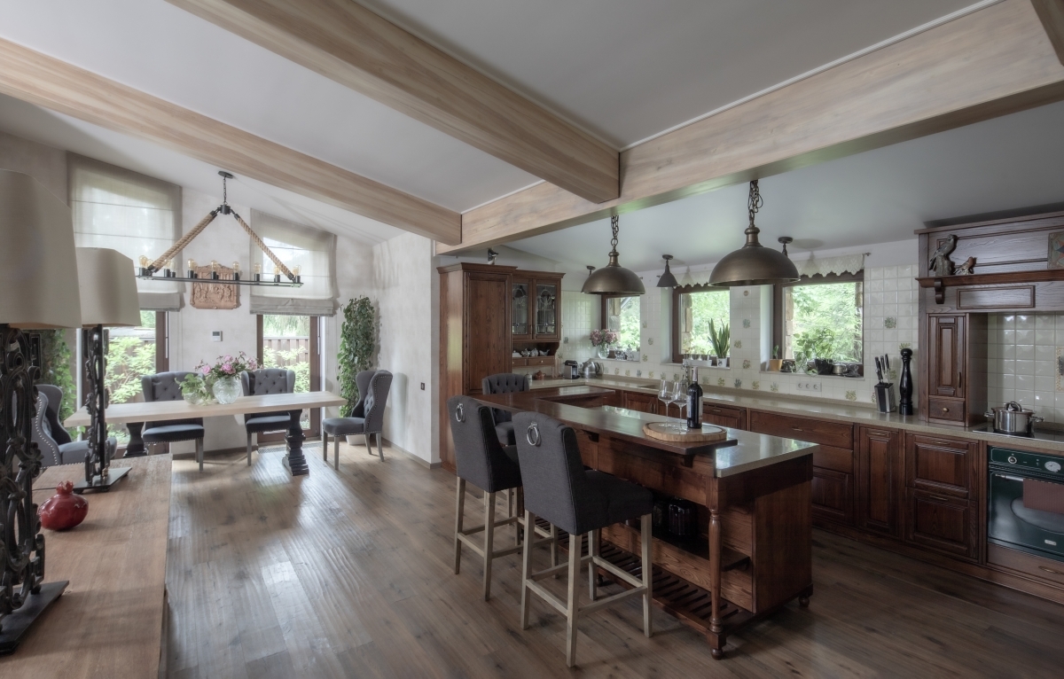 Кухня решена в более глубоких тонах «старого дуба» и мягко контрастирует с остальными помещениями дома. Архитекторы объясняют это решение логикой пространства: интенсивная функциональная нагрузка кухни потребовала соответствующей колористической поддержки: более плотного, собранного цвета. Кухонная мебель выполнена на заказ краснодеревщиками салона «Дилижанс». Кухня решена в более глубоких тонах «старого дуба» и мягко контрастирует с остальными помещениями дома. Архитекторы объясняют это решение логикой пространства: интенсивная функциональная нагрузка кухни потребовала соответствующей колористической поддержки: более плотного, собранного цвета. Кухонная мебель выполнена на заказ краснодеревщиками салона «Дилижанс».