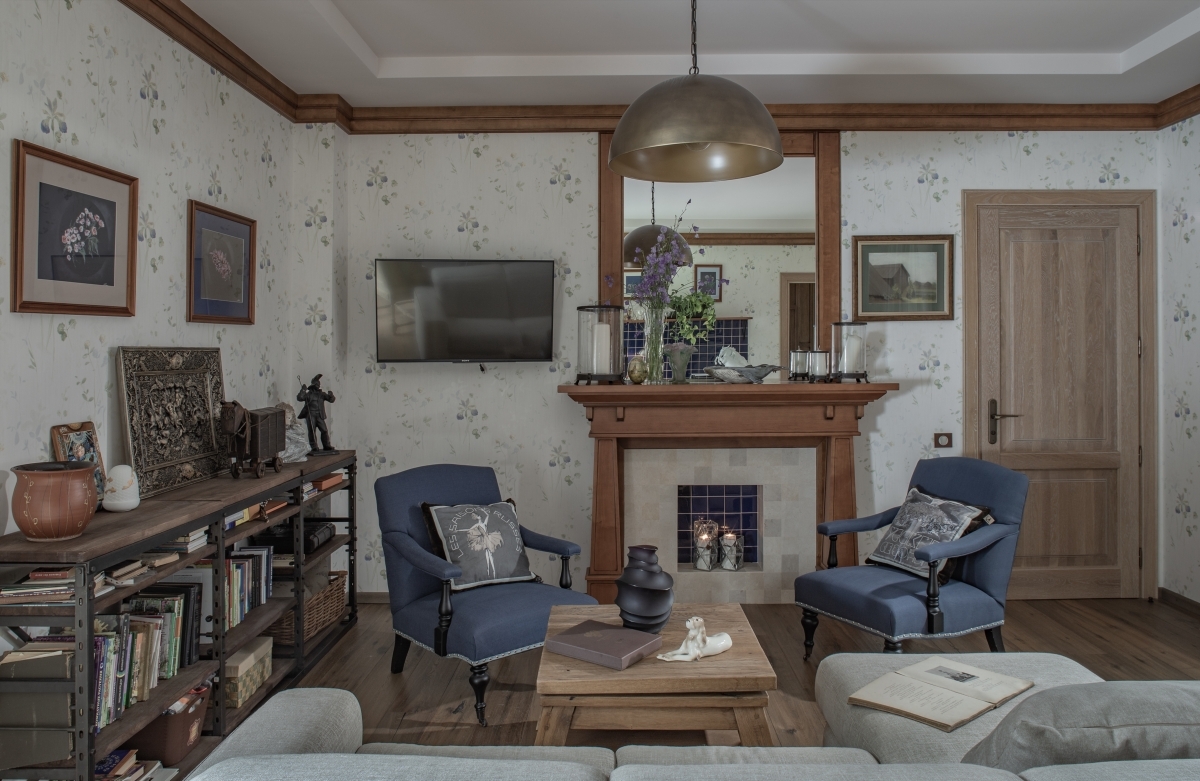 Фрагмент кабинета хозяйки на первом этаже. Интерьер сочетает функциональность с домашним уютом: помимо рабочей зоны, здесь есть камерный уголок у камина — для чтения и неспешного общения. Камин, рабочий стол, стеллаж для книг — всё это разработано специально для этого помещения архитекторами. Декоративные подушки на креслах сделаны по эскизам Лизы Барабадзе из лимитированной серии «Русские сезоны». Фрагмент кабинета хозяйки на первом этаже. Интерьер сочетает функциональность с домашним уютом: помимо рабочей зоны, здесь есть камерный уголок у камина — для чтения и неспешного общения. Камин, рабочий стол, стеллаж для книг — всё это разработано специально для этого помещения архитекторами. Декоративные подушки на креслах сделаны по эскизам Лизы Барабадзе из лимитированной серии «Русские сезоны».