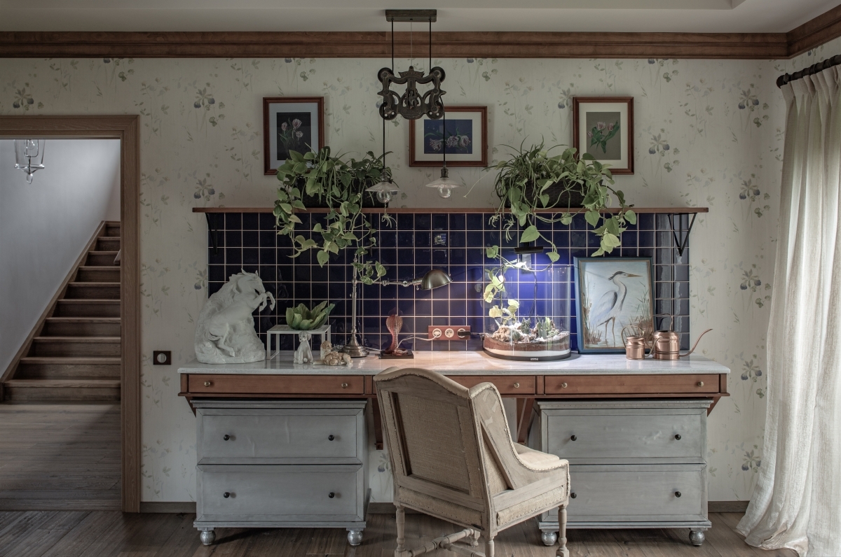Кабинет хозяйки. Фартук сделан из французской плитки ручной работы, ее чернильный цвет отлично оттеняет сочную зелень рассады. Столешница стола — из мрамора: смотрится изящно и удобна в уборке. На стене — графика Лизы Барабадзе. Кабинет хозяйки. Фартук сделан из французской плитки ручной работы, ее чернильный цвет отлично оттеняет сочную зелень рассады. Столешница стола — из мрамора: смотрится изящно и удобна в уборке. На стене — графика Лизы Барабадзе.