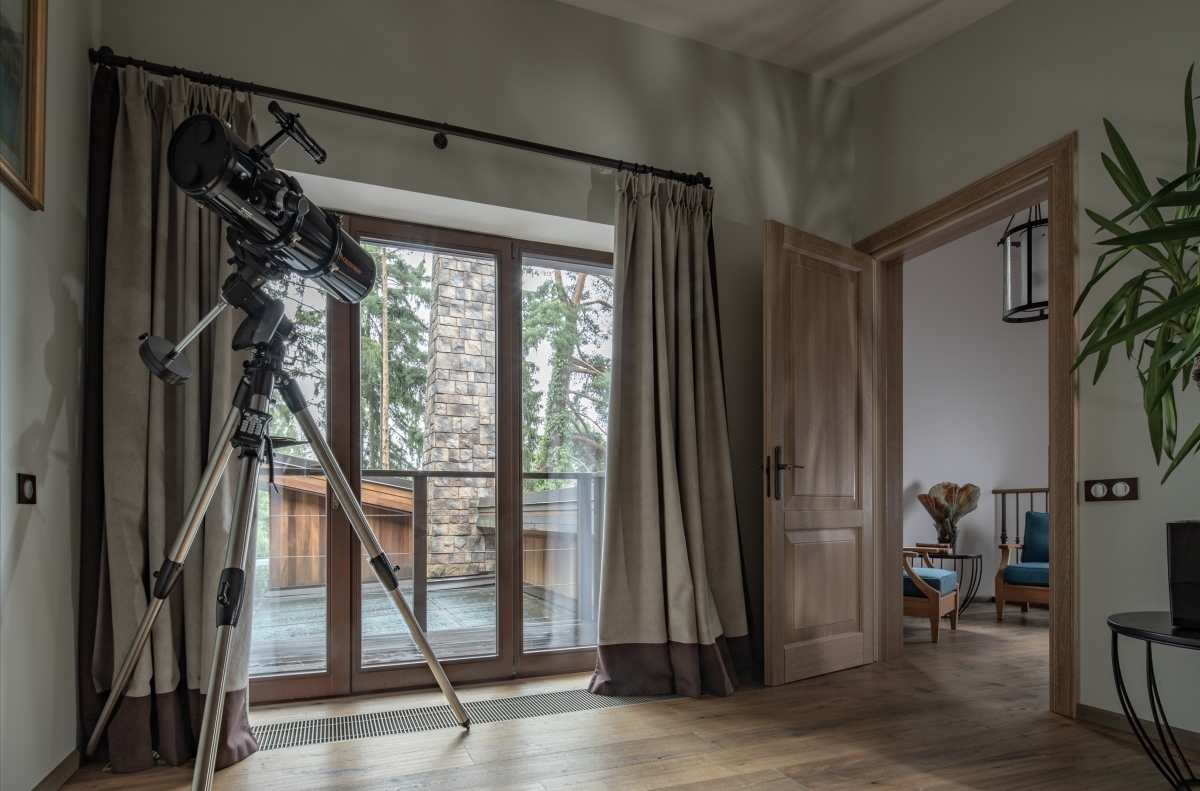 Функциональность пространства отражает понимание современного семейного уклада. Продуманная планировка, в которой пентри (кладовая) связывает кухню с входной зоной, облегчая бытовые процессы. Главной архитектурной особенностью стала застекленная терраса — сердце дома и место для неспешного отдыха с видом на природу. Отсутствие ограждения на этой террасе визуально расширяет пространство и усиливает связь с ландшафтом. Именно так формируется особая атмосфера: не показной роскоши, а глубокого, осмысленного комфорта, где дом становится живым организмом, настроенным на ритмы природы и потребности души.