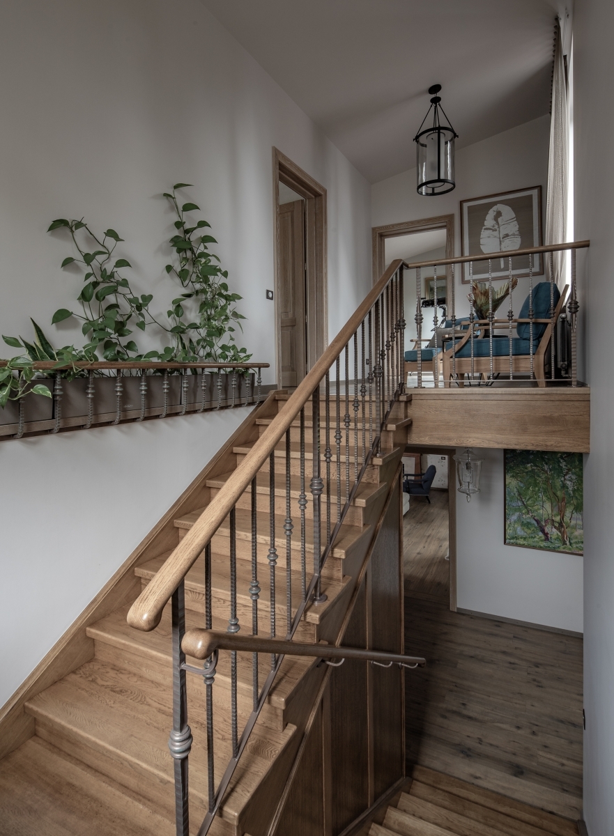 Пространственная организация следует философии функционального комфорта. Правое крыло дома — сердце общения: полуторасветная гостиная с камином и выходом на террасу создает атмосферу семейного единения. Левый флигель — приватная зона с просторными спальнями-сьютами и продуманными кабинетами, настраивающими на уединенное созерцание природы. Особую роль в проектировании интерьера играет эмоциональная связь с экстерьером. Спальня хозяйки имеет выход в сад, а кабинет оборудован практичным столом садовника и стеллажами для растений — здесь философия дома проявляется в деталях повседневности.
