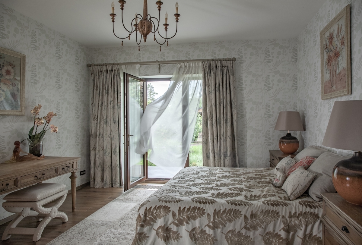 Главная спальня решена как автономная зона комфорта: прямой доступ в сад дарит ощущение единения с природой, а логичные связи с санузлом и гардеробной создают идеальную картину современного и функционального жилья. Ковер, Kulturakovrov. Шторы и покрывало, компания «МарЛи». Главная спальня решена как автономная зона комфорта: прямой доступ в сад дарит ощущение единения с природой, а логичные связи с санузлом и гардеробной создают идеальную картину современного и функционального жилья. Ковер, Kulturakovrov. Шторы и покрывало, компания «МарЛи».