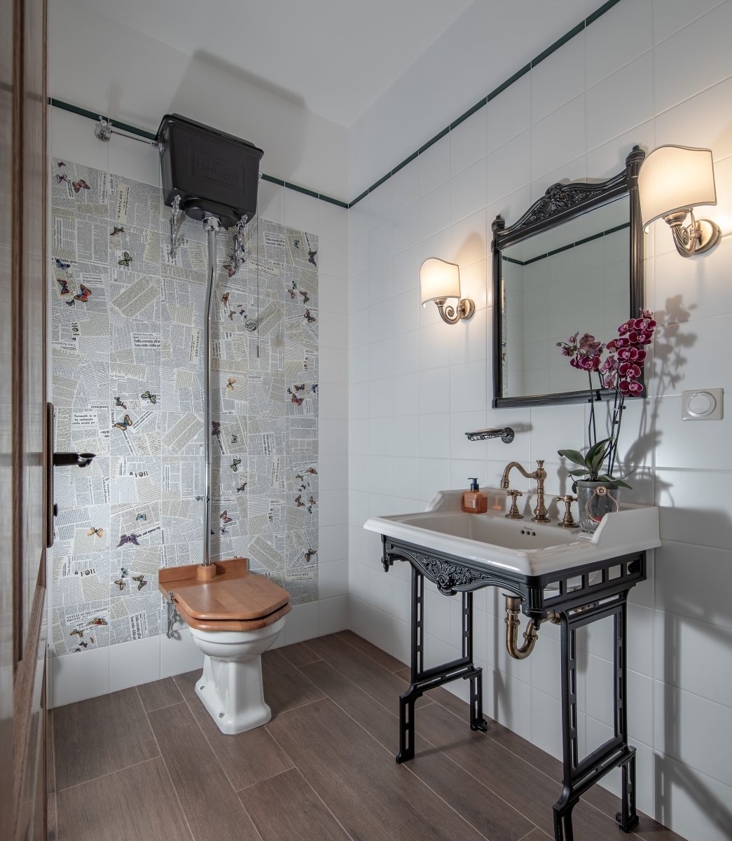 Фрагмент санузла. Ретроуют строится на контрастах: прохладная белизна кафеля и графичность панно из плитки по эскизам Форназетти смягчаются теплом деревянного пола от салона «Дилижанс». Фрагмент санузла. Ретроуют строится на контрастах: прохладная белизна кафеля и графичность панно из плитки по эскизам Форназетти смягчаются теплом деревянного пола от салона «Дилижанс».