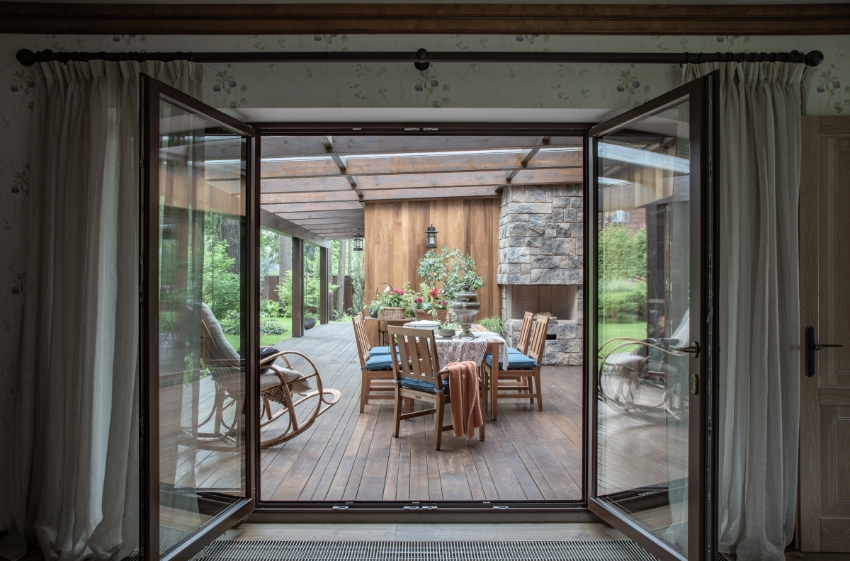 Вид из прихожей на террасу. Застекленная терраса с камином и обеденной зоной — центр притяжения дома. Сюда ведут пути из всех ключевых помещений: центрального холла, бани, кабинета хозяйки и гостиной. Вид из прихожей на террасу. Застекленная терраса с камином и обеденной зоной — центр притяжения дома. Сюда ведут пути из всех ключевых помещений: центрального холла, бани, кабинета хозяйки и гостиной.