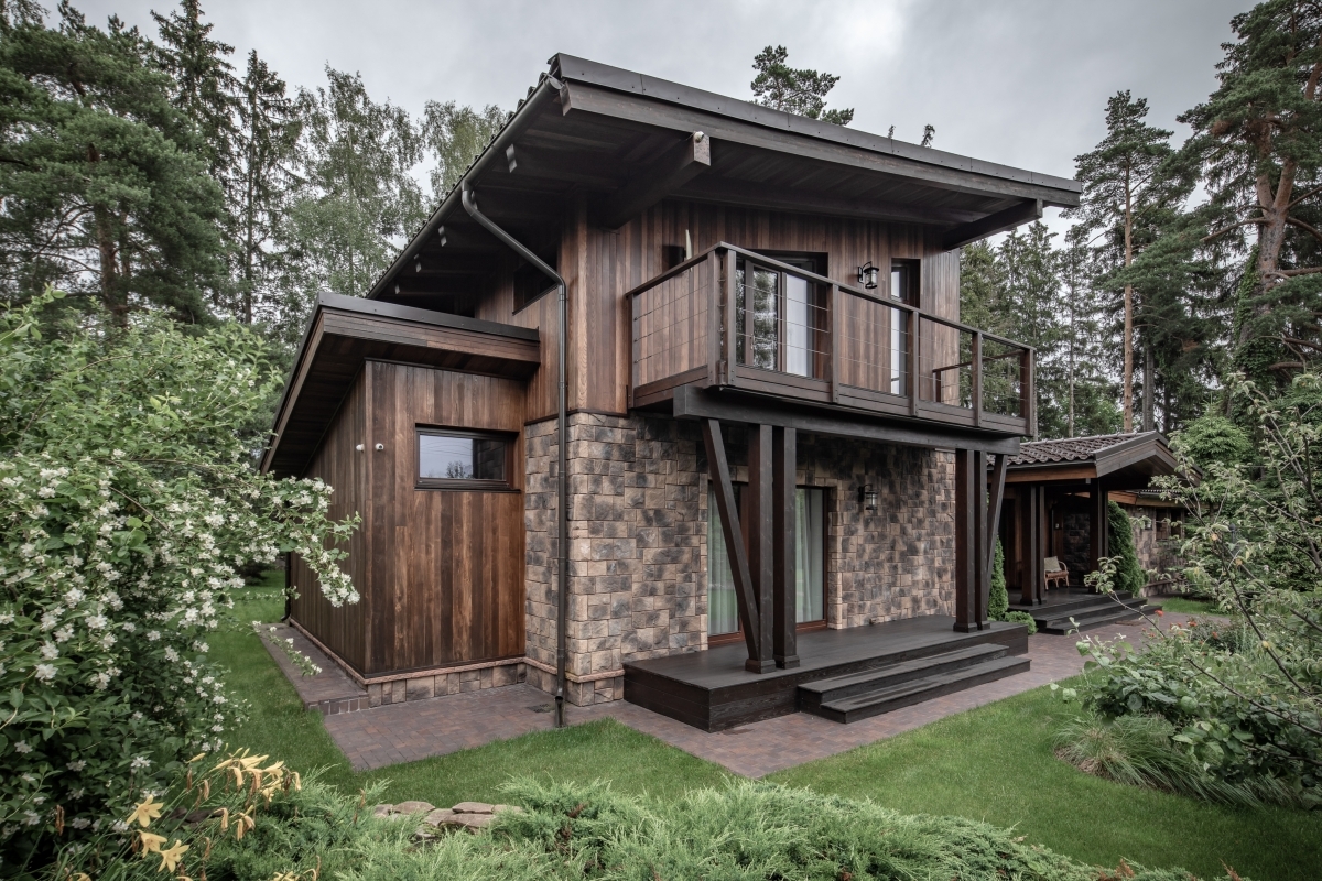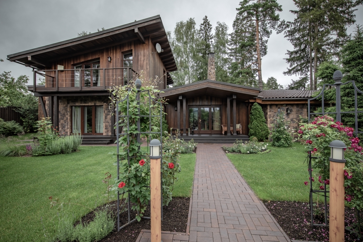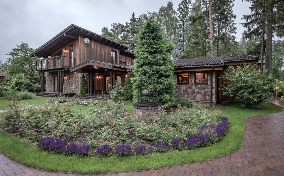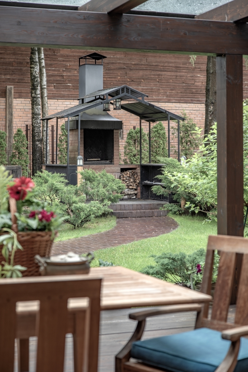 Во внутреннем дворе, под сенью деревьев, расположена беседка для барбекю, большая застекленная терраса с камином и обеденным столом. «Архитектурная концепция — дом для отдыха на природе, Дерево, камень, черепица цвета шоколада, большие окна... Использование натуральных материалов в отделке в духе экомодерна. Для нас было очень важно создать образ дома, который органично вписывается в природу, сам является частью природной среды», — комментирует замысел Сергей Барабадзе. Строительство, отделочные работы, компания VEL Club. Во внутреннем дворе, под сенью деревьев, расположена беседка для барбекю, большая застекленная терраса с камином и обеденным столом. «Архитектурная концепция — дом для отдыха на природе, Дерево, камень, черепица цвета шоколада, большие окна... Использование натуральных материалов в отделке в духе экомодерна. Для нас было очень важно создать образ дома, который органично вписывается в природу, сам является частью природной среды», — комментирует замысел Сергей Барабадзе. Строительство, отделочные работы, компания VEL Club.