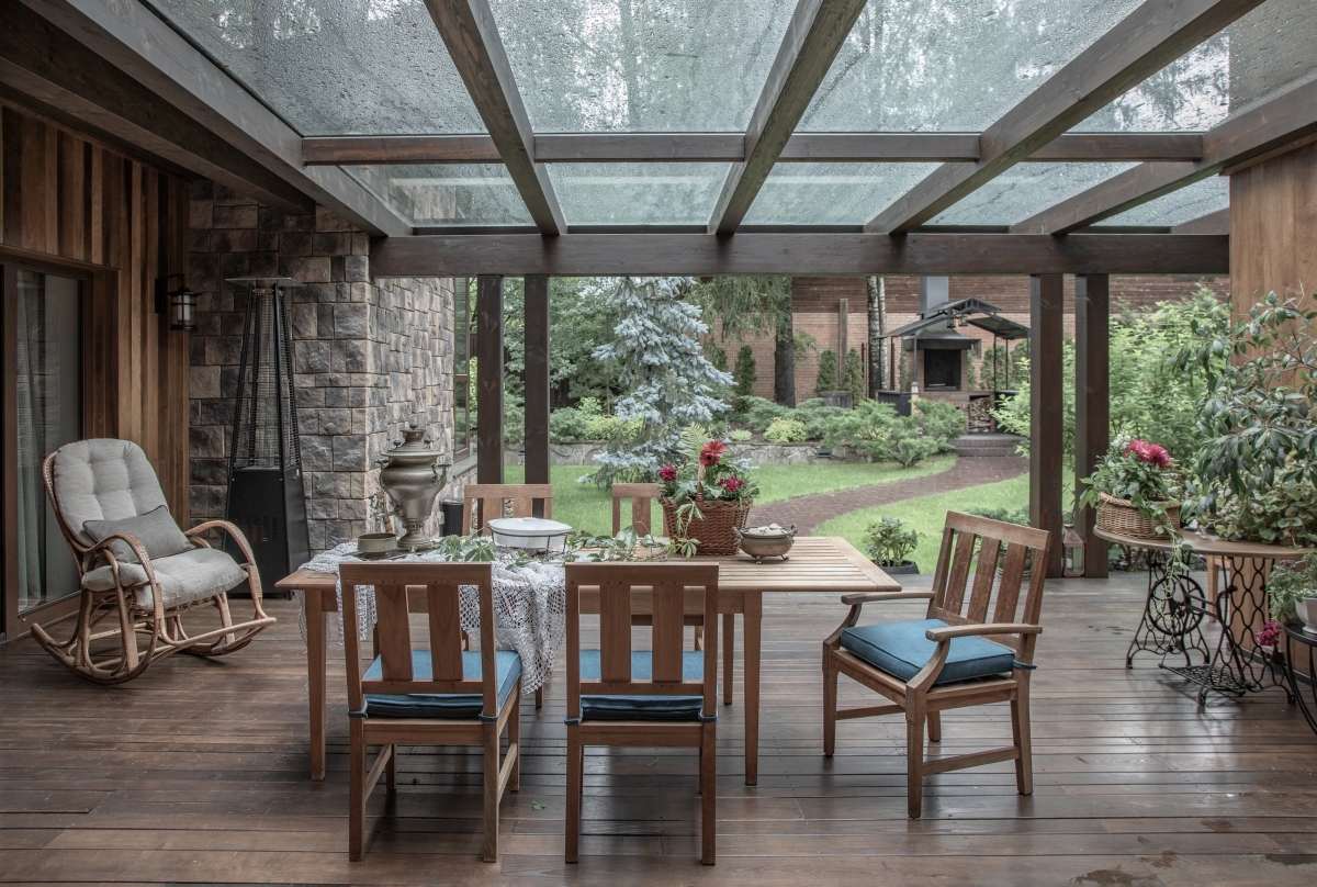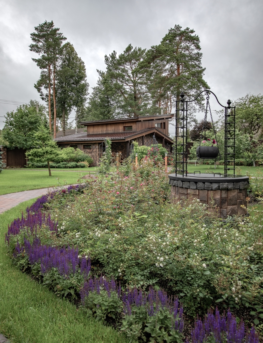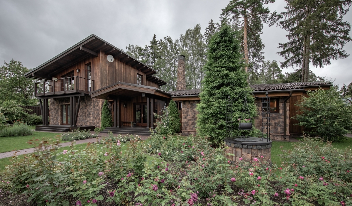 Во внутреннем дворе, под сенью деревьев, расположена беседка для барбекю, большая застекленная терраса с камином и обеденным столом. «Архитектурная концепция — дом для отдыха на природе, Дерево, камень, черепица цвета шоколада, большие окна... Использование натуральных материалов в отделке в духе экомодерна. Для нас было очень важно создать образ дома, который органично вписывается в природу, сам является частью природной среды», — комментирует замысел Сергей Барабадзе. Строительство, отделочные работы, компания VEL Club. Во внутреннем дворе, под сенью деревьев, расположена беседка для барбекю, большая застекленная терраса с камином и обеденным столом. «Архитектурная концепция — дом для отдыха на природе, Дерево, камень, черепица цвета шоколада, большие окна... Использование натуральных материалов в отделке в духе экомодерна. Для нас было очень важно создать образ дома, который органично вписывается в природу, сам является частью природной среды», — комментирует замысел Сергей Барабадзе. Строительство, отделочные работы, компания VEL Club.