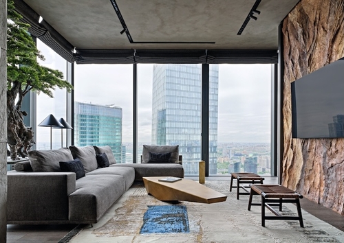 Сергей Трегубов воплотил эмоцию чувственности и физического единения в интерьере небоскреба «Москва-Сити». Мультифактурные поверхности, восточные мотивы и авторское искусство создали оазис покоя, где панорама столицы становится частью интерьера.