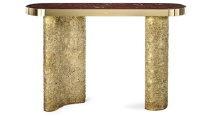 Консоль Moco запоминается основанием из фактурной латуни в сочетании со столешницей из мрамора Red Jasper.